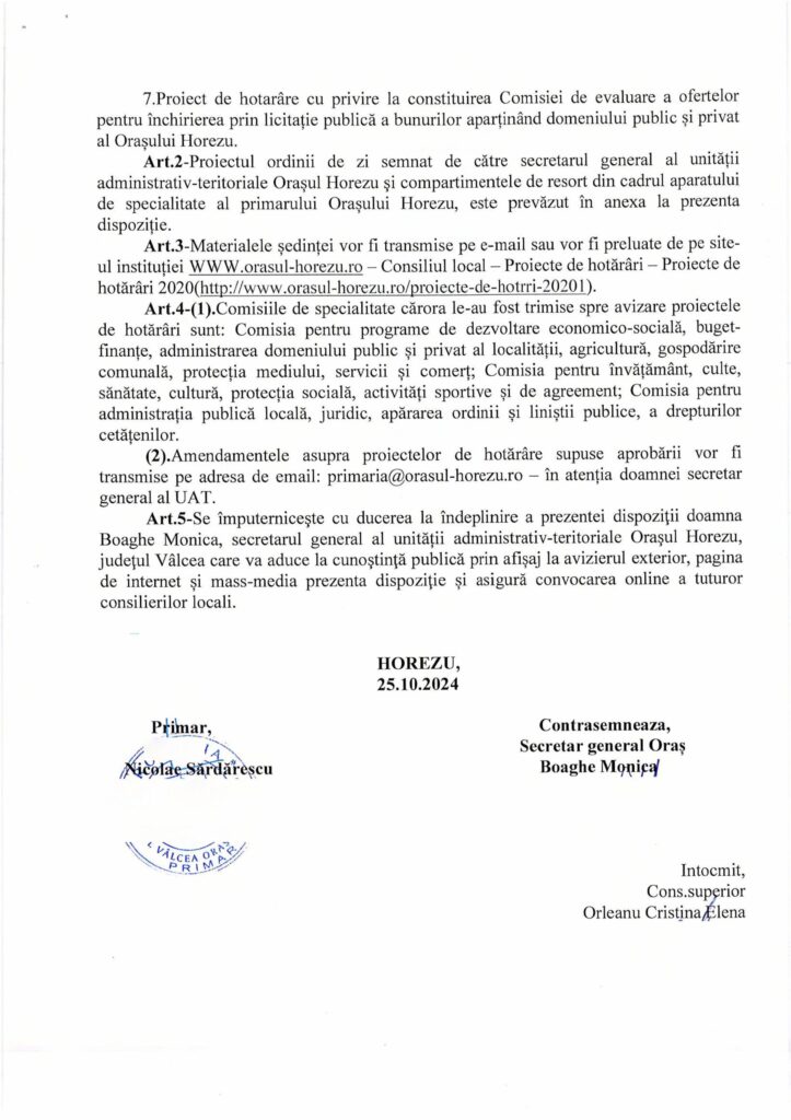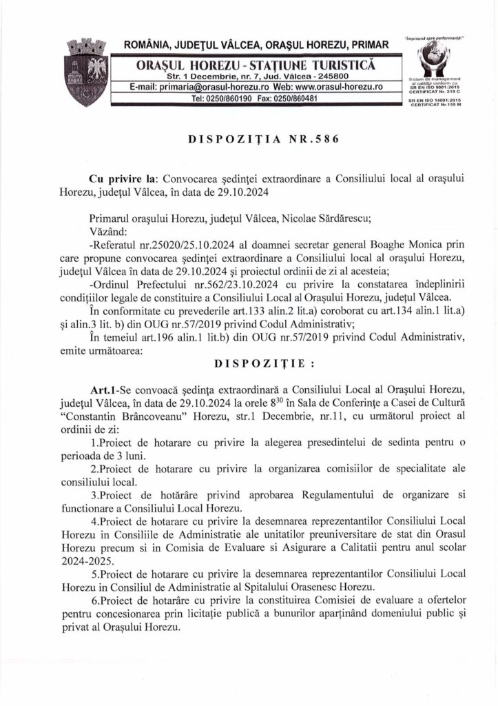 Cateva urgente legate de functionarea noului Consiliu Local ales, dar fara alegerea vice-primarului pe ordinea de zi. Post navigation Sedinta ExtraOrdinara de Consiliu Local Horezu din 29 Octombrie 2024